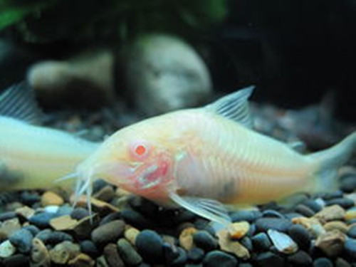 白鼠,原产于南美洲水域,现大多为人工培育种。白鼠是咖啡鼠的白子品种,体表为乳白色,红眼明晰可见,性情温和,可成群饲养。卵生,可与小型鱼混养,适合水草和沉木的水族箱,底层鱼。建议铺上细的暗色底砂以保护他们的触须。白鼠鱼属于无鳞鱼,怕盐怕药,所以非到必要时请不要乱下什么水制稳定剂、甲基兰等化学药剂,就算是生病治疗药量也不能超过一半。很多鱼友发现白鼠鱼总是神秘死亡,没有任何征兆,只是腹部消瘦,这很大的原因是因为饥饿而死,白鼠鱼属于底层鱼,性情温顺(大部分),时常因为我们投喂饲料过少而吃不到食,时间一长就饿死,所以建议投喂一定的沉底饲料:如血虫、汉堡,这样既可以让其它鱼饱餐,同时也饿不到白鼠鱼。