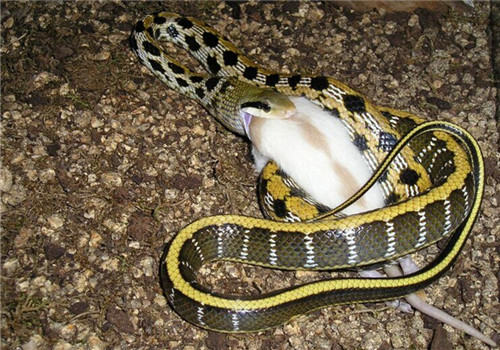 摄食行为是动物本身的生存和种群繁衍所必需的基础行为。黑眉锦蛇摄食多以游荡方式觅食,经常在小动物出没的地方游动,捕食率特别高,只要小动物从其附近经过就有命丧蛇腹的危险。