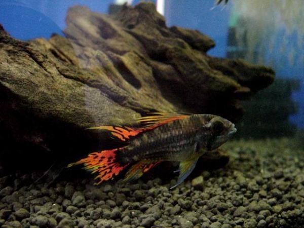 凤尾短鲷体型修长,在成熟雄鱼的背鳍有6根硬棘,口器宽大,背鳍呈琴弦状,在背鳍的末端及尾鳍会有橘红色的斑点分布,尾巴为凤尾,故因而被称为凤尾短鲷。像大多数短鲷一样凤尾短鲷的公鱼和母鱼的外观差别很大。它们是相对容易繁殖的短鲷品种。虽然他们会不时地与同种或异种鱼支争斗,仍尚不致置对方于死地。喜爱弱酸性至中性的软水,肉食性。