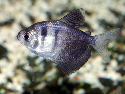 体高、侧扁,最长可达8厘米。前半身银灰色,有2条黑长斑,后半身黑色,背鳍高而短在背鳍上中部。背鳍、脂鳍、臀鳍均黑色,尾鳍深叉形透明无色。臀部与腹部一样宽大,臀鳍也特别宽大延长直至尾柄,构成了奇特的形体,游动犹如摇滚舞。