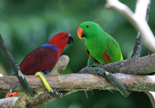 折衷鹦鹉还有一个非常大的特点就是它们的雌雄鸟外观差异很大,有些人第一次见到它们的时候甚至可能会认为雌雄鸟分别是两个不同品种的鸟类。雄鸟通常身体为翠绿色,而雌鸟的身体则为深红色,腹部呈蓝紫色。